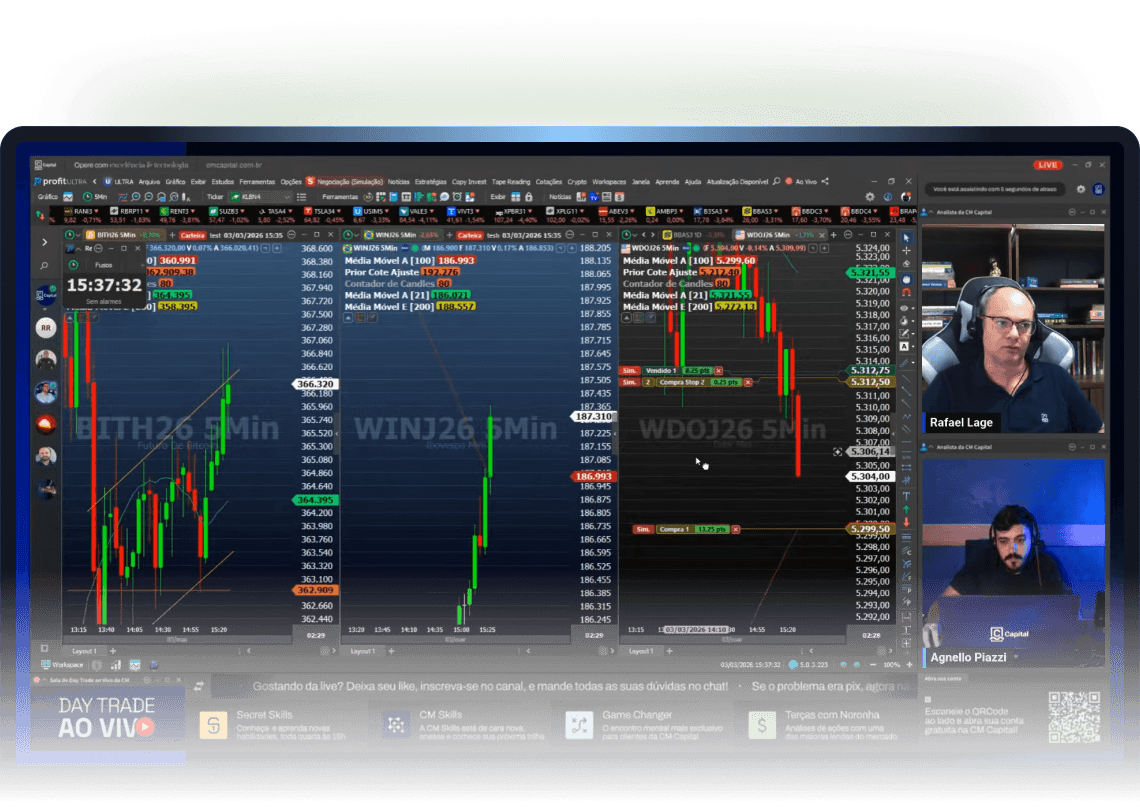 Acompanhe a Sala ao Vivo durante o pregão, aprenda com os analistas CNPI da CM Capital e maximize a possibilidade de ganhos em suas operações